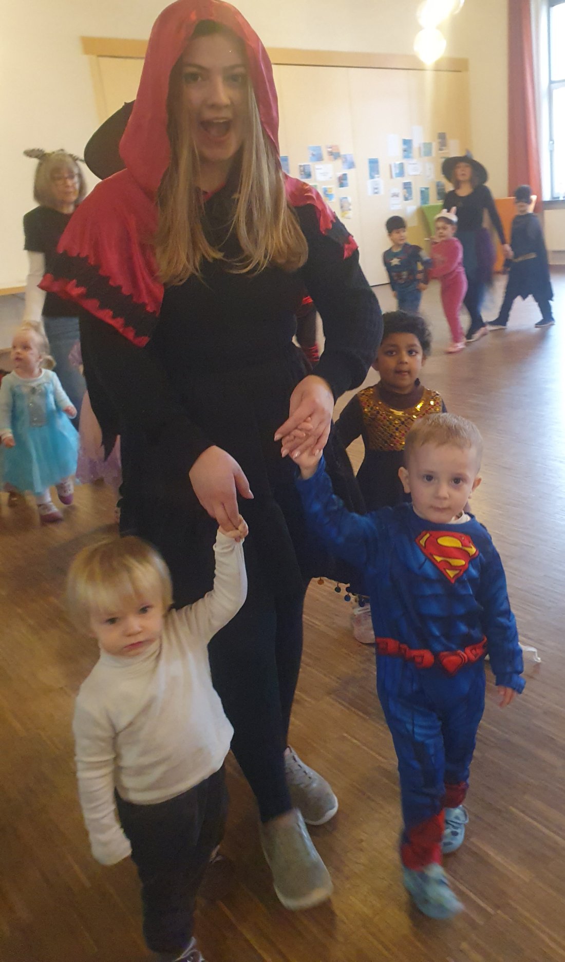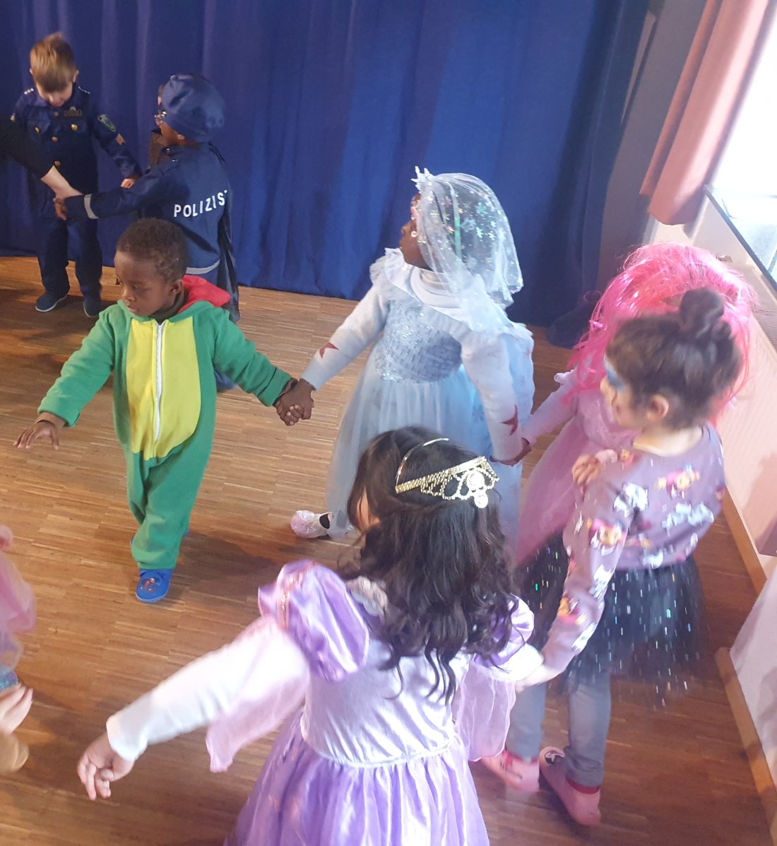 Um 10:00 Uhr gingen wir gemeinsam in den Saal. Dort wartete eine schöne Überraschung auf die Kinder: Mit Musik, Tanz und Gesang wurde ausgelassen gefeiert. Die Kinder hatten großen Spaß, bewegten sich viel und genossen die fröhliche Stimmung.