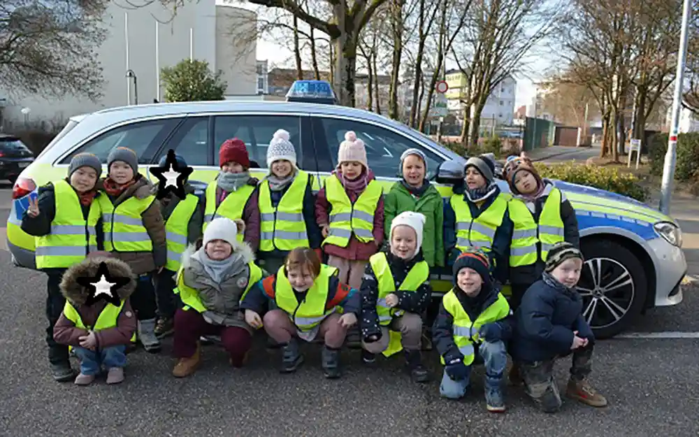 Im Januar kam die Verkehrspolizei zu uns in den Kindergarten. Gemeinsam mit den Kindern sprachen die Polizisten über die Aufgaben der Polizei und sie erklärten den Kindern, wie man sich richtig im Straßenverkehr verhält. Draußen übten wir, wie man sicher über die Straße geht. Dabei lernten die Kinder, zuerst nach links, rechts, links zu schauen, bevor sie losgehen. Außerdem durften die Kinder das Polizeiauto erkunden und sich alles genau anschauen. Das war für alle sehr spannend und aufregend. Zum Ausklang schauten wir uns einen Kinderfilm über die Verkehrsregeln an. Jedes Kind freute sich über die Spende einer Warnweste und eines Verkehrshefts und bedankte sich bei den Polizisten.