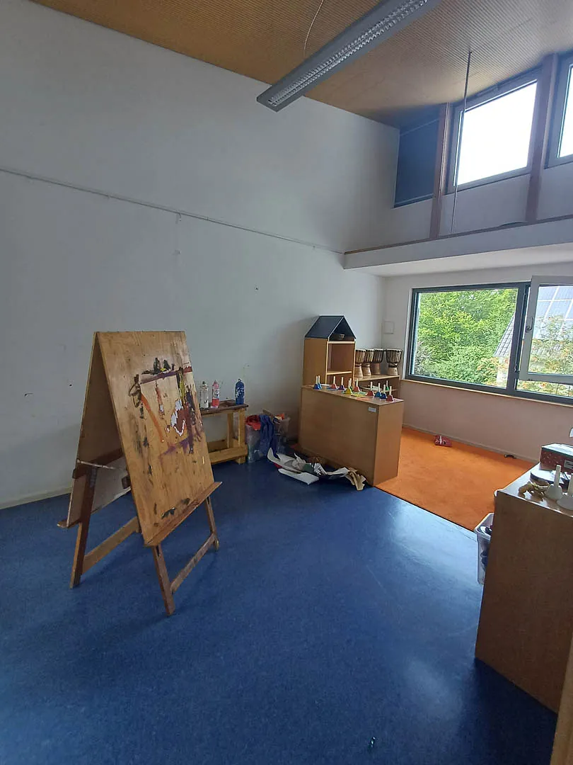 Hämmern, sägen, feilen, kleben, schnitzen, bauen, konstruieren, werkeln oder mit Fingerfarbe malen; im Werkraum sind der Fantasie und Kreativität keine Grenzen gesetzt. Durch die Fensterfront strahlt helles Tageslicht in den Raum. Ein Werktisch steht mittig im Raum und ist somit von allen Seiten gut zugänglich, sodass viele Möglichkeiten zum Werken geboten sind. Aus den verschiedensten Materiealien und Werkzeugen basteln und gestalten die Kinder mit viel Begeisterung und Aufmerksamkeit die unterschiedlichsten Kunstwerke.