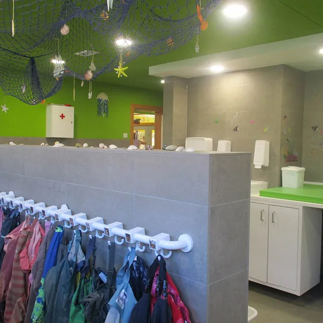 In unserem Haus befindet sich in jeder Etage ein Kinderbadezimmer sowie zusätzlich ein eigener Sanitärbereich für die Krippenkinder. Die Badezimmer werden nicht nur für den Toilettengang und das Händewaschen genutzt, sondern vielmehr als Raum für Sinneserfahrungen mit dem Element Wasser. Die Spiegel fördern zusätzlich das Selbstbild und die Ich-Identifikation.