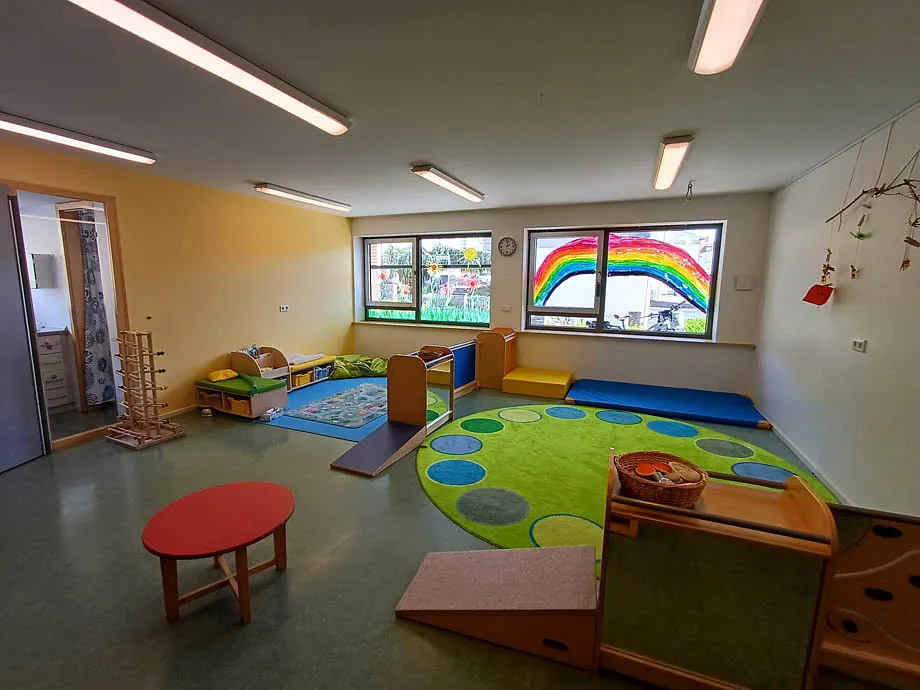 In unserem Bewegungsraum können die Kinder ihrem Bedürfnis nach Bewegung nachkommen. Wir bieten regelmäßig offene und gezielte Bewegungseinheiten an. Verschiedene Geräte und Materialien regen die Kinder zu vielfältigen Bewegungsformen, wie Klettern, Balancieren, Rutschen….an. Die Kinder können Bewegungsabläufe trainieren und ein positives Körpergefühl ausbilden. Die motorische Entwicklung wird gefördert, Ausdauer, Kraft, Koordination und das soziale Miteinander werden gestärkt.
