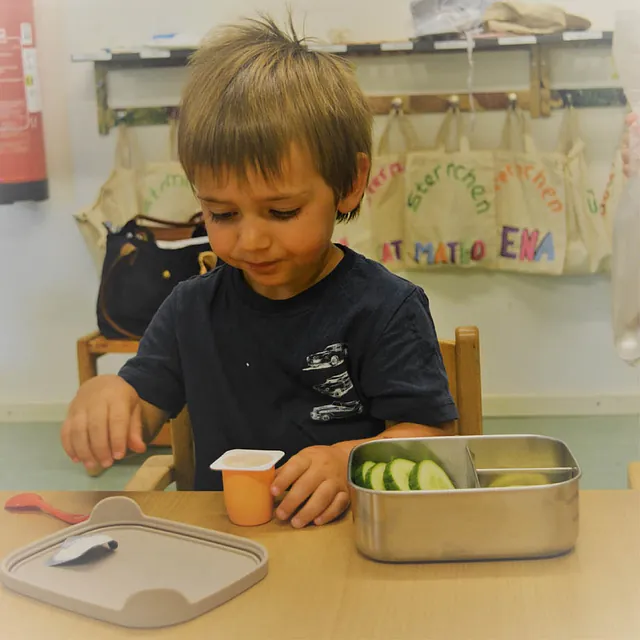 Das Restaurant befindet sich im 1. Obergeschoss direkt neben der Mäusegruppe. Hier verbringen die Mäusekinder ihre Frühstückszeit. Die „Warmesser“ der Bären- und Igelgruppe nehmen hier ihr frisch gekochtes Mittagessen, welches täglich von der Carl-Orff-Schule geliefert wird zu sich. Beim Mittagessen erfahren die Kinder ein gemeinsames Miteinander, eine schöne Tischkultur, sich gegenseitig zu unterstützen, selbstständiges Handeln und Verantwortungsbewusstsein.